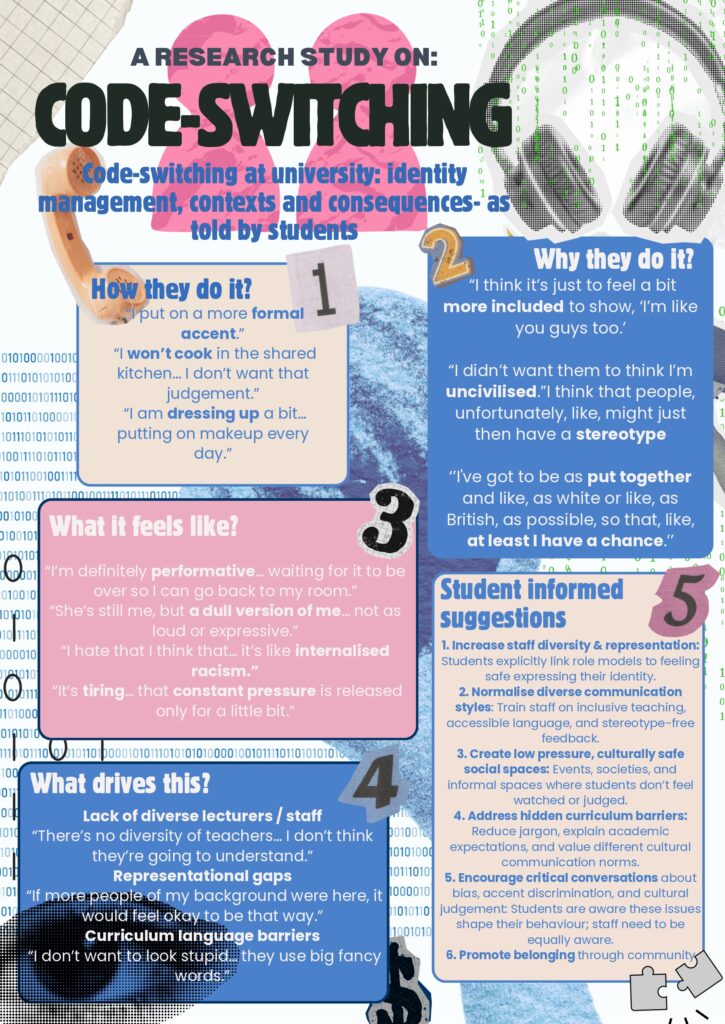 “Many students adapt themselves to fit perceived norms. I did it and it became normal to be a completely different person in class. But why? Often, it is out of a need to belong, to avoid negative stereotyping, or to secure opportunities that we think we would not get if we were being our authentic selves.”