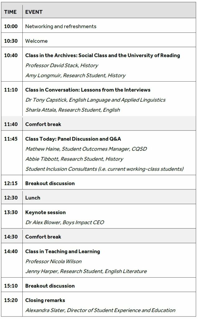 4th March 2026 – The Celebrating Class conference on Whiteknights Campus will be a series of talks about class and the University of Reading, with a keynote speech from Alex Blower, founder of Boys Impact.